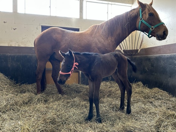 1月27日早朝、当場繫養の繁殖牝馬ベルキューズ号がチュウワウィザードの牡馬を出産しました。